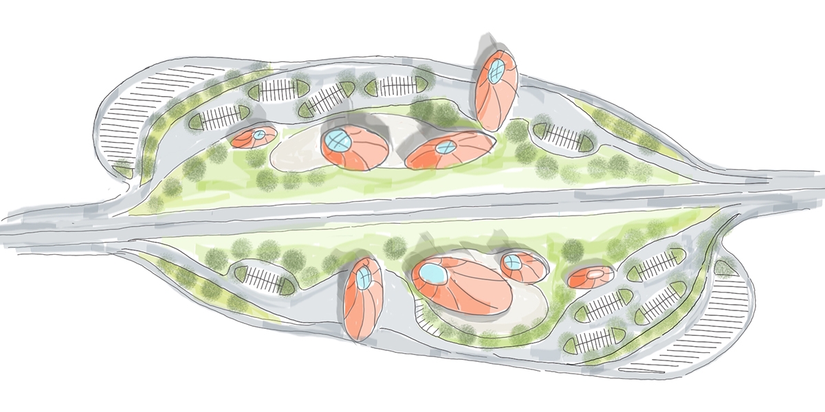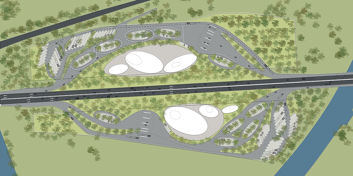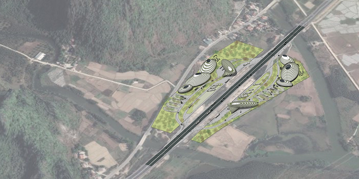 The project was the design of three Freeway Rest Stops along the route between Mong Cai and Ha Long in the north of Vietnam. This rest stop, around 20 km outside of Ha Long, reflects the surrounding hilly landscape. Clusters of egg-shaped volumes, each with an oculus skylight, are arranged on both sides of the highway. The hill-eggs are sliced horizontally to create green roof planters, and to let in more light to the convenience store and restaurants below. The oval shapes are carried through in the parking layout. The design is a remarkable event - whether you stop or not - along this route.